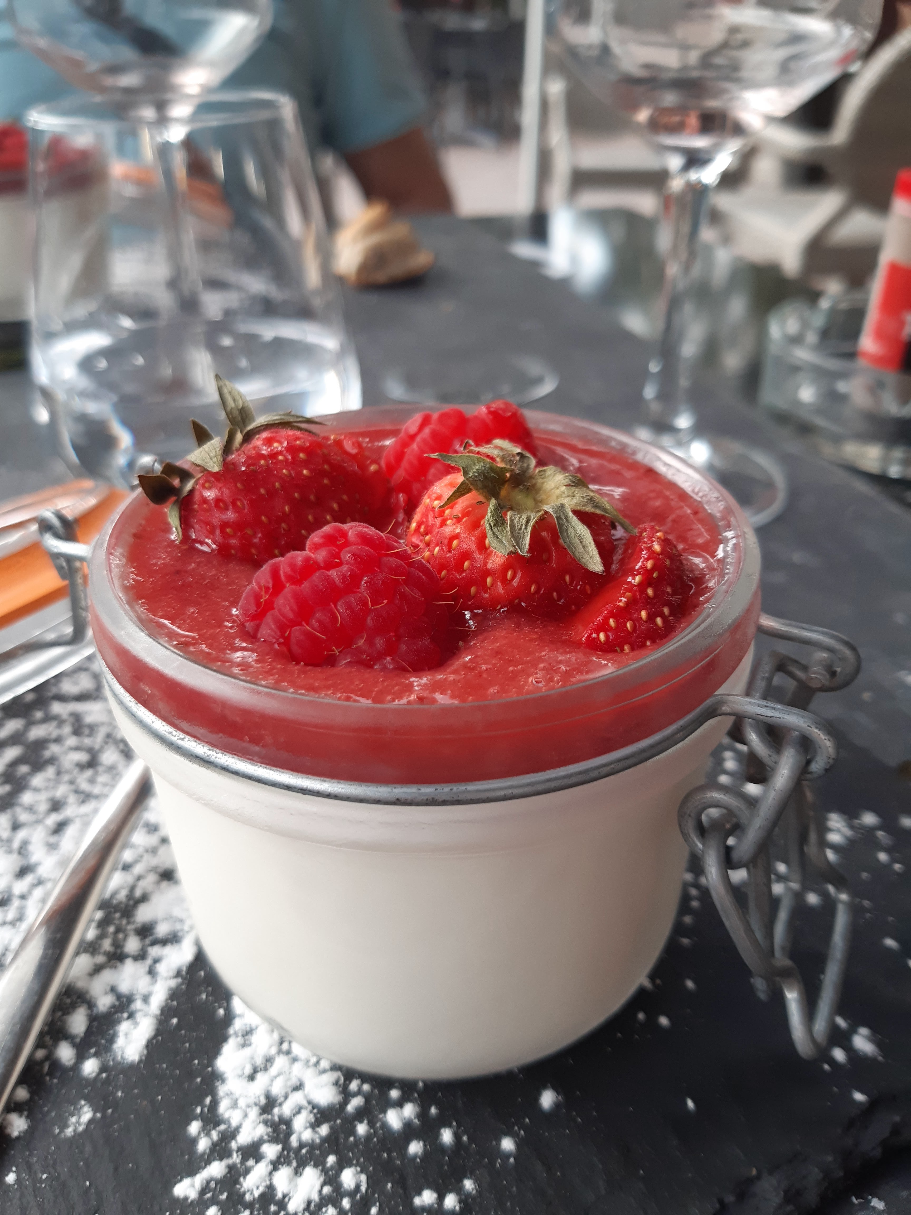 Nous avons très bien mangé c'était le plat du jour du dimanche une brochette de la mer avec une semoule de petits légumes, un régal et de saison car il faisait encore chaud, en dessert un éclair tout chocolat fait maison comme le reste et il était divin, un simple partage sur les réseaux sociaux à suffit à faire réagir beaucoup de monde. 👍😊 ça a fait des envieux ❤